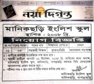মানিকছড়ি ইংলিশ স্কুলে সহকারী শিক্ষক নিয়োগ সংক্রান্ত বিজ্ঞপ্তি